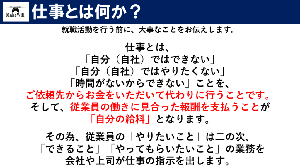 必ずしも全員が「自分がしたいこと=会社が仕事してほしいこと」にはならず、仮にやりたい仕事に就いたとしても、100%全部自分がやりたい業務になる人のほうが少ないです。